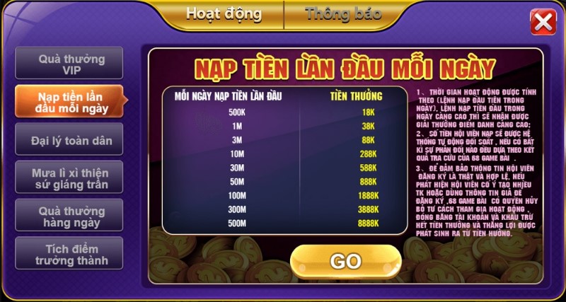 + Ưu đãi dày đặc, giá trị ưu đãi lớn, áp dụng cho nhiều đối tượng khác nhau: Ưu đãi, khuyến mại là những chương trình được xây dựng để tạo sức hút, thể hiện sự quan tâm, tình cảm, lời tri ân đối với người chơi vì đã tin tưởng, lựa chọn và gắn bó, đồng hành cùng 68 Game bài. Theo đó, cổng game đã triển khai hàng loạt chương trình hấp dẫn, để người chơi có thể lựa chọn và tận hưởng, bất kể là người chơi cũ hay mới.